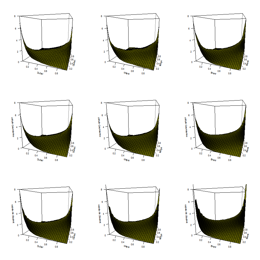 也可以将copula密度可视化(上面有一些非参数估计,下面是参数copula)