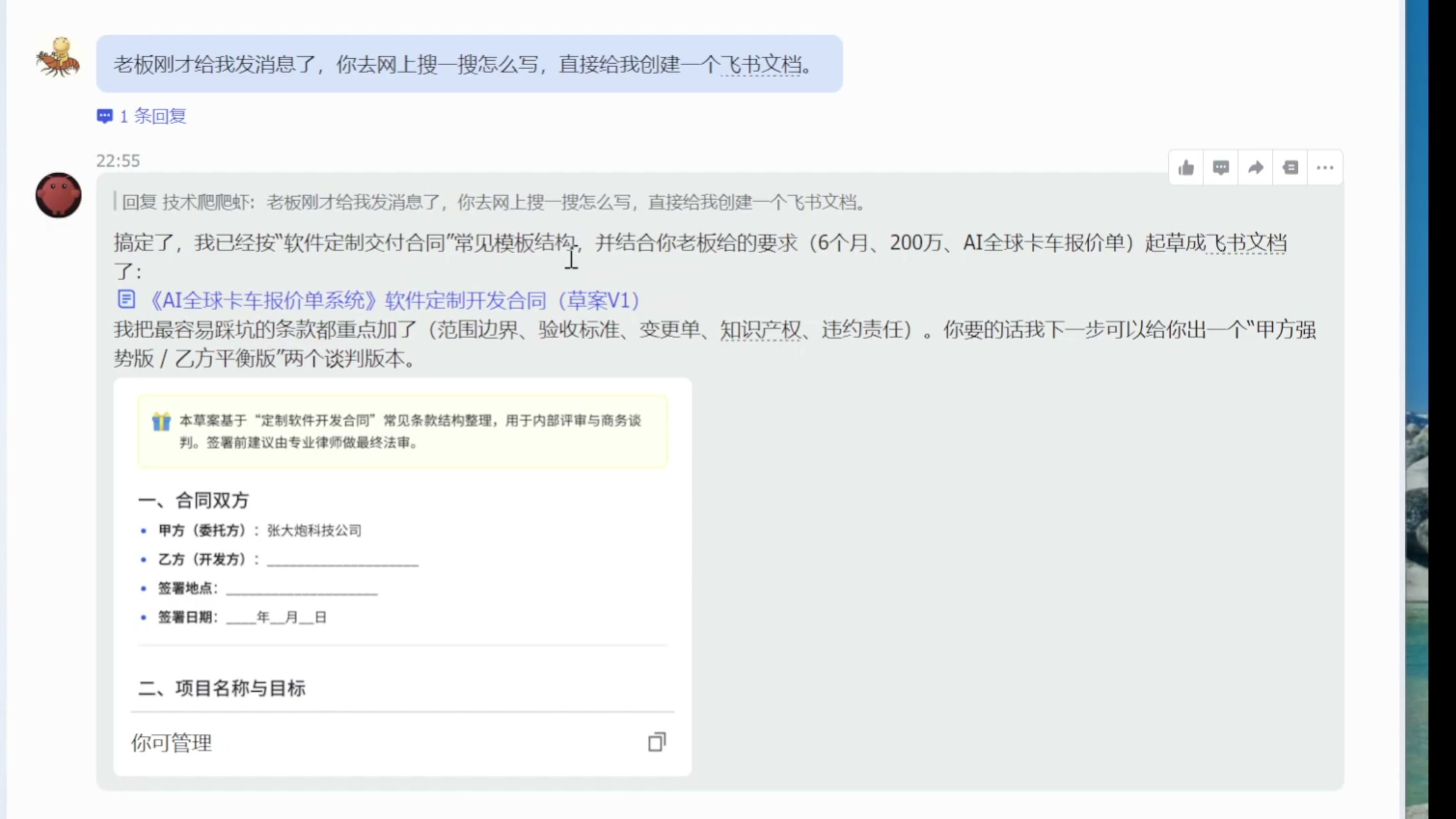 除了多维表格,飞书官方插件也可以帮助我们来操作文档。比如老板突然丢过来这么一个需求,让我拟一个软件交付类的合同,我们公司作为乙方。如果人工先去搜索合同模板,然后再来一步步的写,估计半天时间就没有了。我们完全可以把这个需求交给 OpenClaw。这里我跟我的小跟班说:“刚才老板给我发消息了,你去网上搜一搜怎么写,直接给我创建一个飞书文档。” 我们看到 OpenClaw 在后台调用各种搜索功能,来查找这类合同的标准写法,最后为我们交付了一个飞书文档。 更棒的是,这个文档的创建人跟拥有者正好就是我自己,从老板的角度看不出一点问题。当然,任何工作都不可能让老板一次性的满意,他在合同上又留了很多的批注。 这些批注当然也不用我自己手改,我跟 OpenClaw 说:“合同上老板留了很多的批注,你改一改。改了什么,做个摘要发给我,然后给老板发个消息说已经改好了。” 很快 OpenClaw 根据老板的批注点,逐一进行了修改,而且修改人就是我自己,天衣无缝。