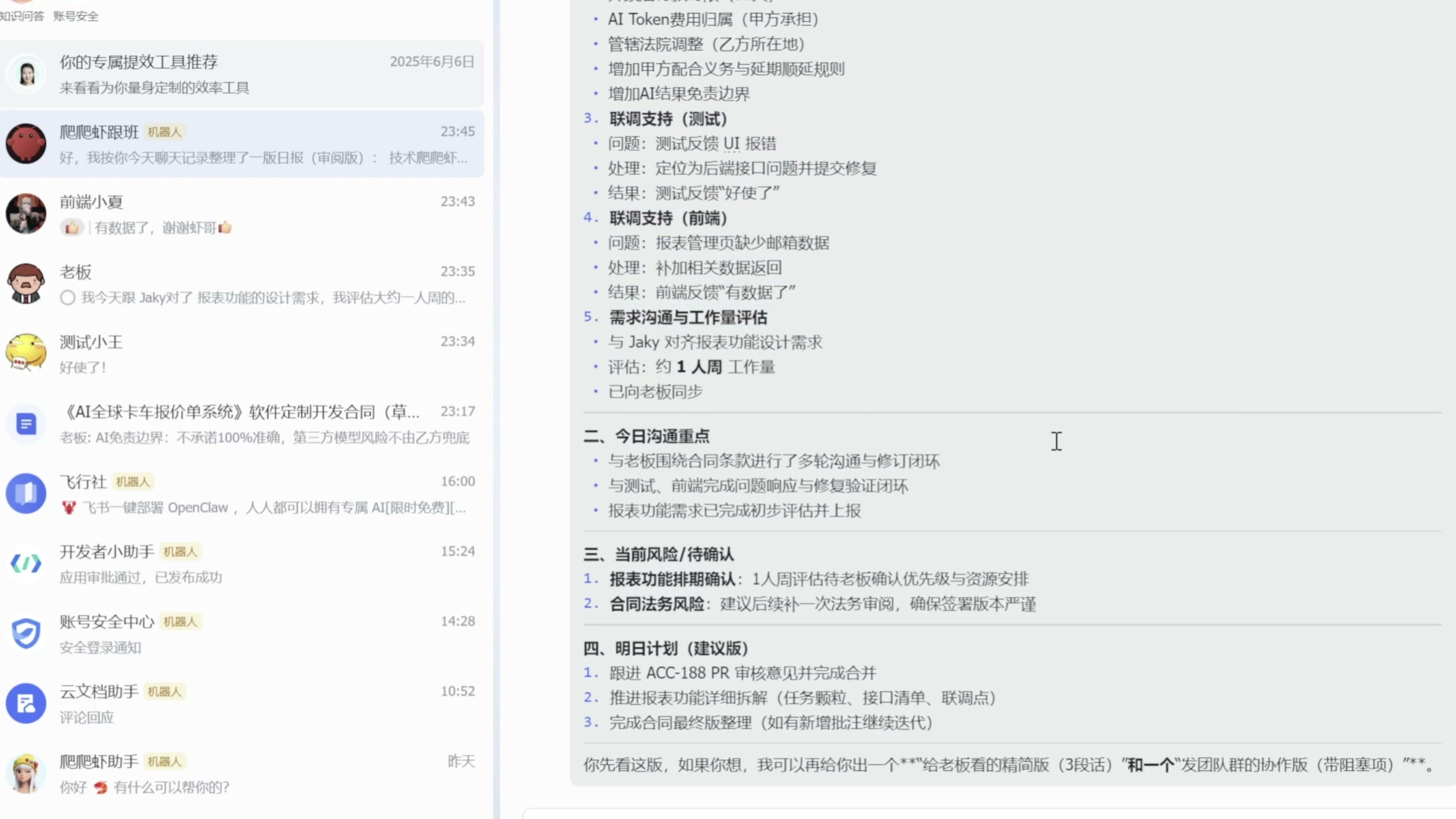如果你们公司的办公软件恰好是飞书,那你有福了。在飞书官方插件的加持下,AI 可以调用飞书里面几乎一切可用资源,来为你的办公场景服务。比如“爬爬虾”是一个程序员,一天里忙于应付各种琐事,到了临下班晕头转向的,甚至都不记得今天干了些啥。这时候如果要我写日报,那就得去翻各种聊天记录,才能勉强捋清楚。这种工作就完全可以交给 OpenClaw 来代劳。“你搜一下我今天所有的聊天记录,整理一个我今天的日报,然后发给我审阅。” OpenClaw 真的能搜索到我所有的聊天记录,比如找到了我今天完成的工单、起草的合同、支持的测试、解决了前端问题,还跟产品经理对需求等等。最后输出了一个日报,发送给我审阅。 我确认后,还能直接让 OpenClaw 以我的身份发给老板。我们再来看一个例子:“查一下老板、前端小夏,还有我明天的日程,找个我们三个都空闲的时间,约个一小时的会。” OpenClaw 查阅了我们三个人的日程安排,找到了一个我们三个人都空闲的时间,直接创建出了会议日程。 在飞书官方插件的加持下,这就是一个最懂我的贴心秘书,简直完美。