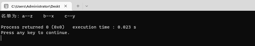 printf("名单为:a--%c\tb--%c\tc--%c\n",i,j,k);