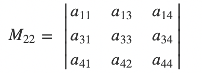 在n阶行列式当中,把(i,j)元素所在的行和列的所有元素全部去除之后,剩下的新的n-1阶的行列式称为(i,j)元的代数余子式,记为Mij列入4阶行列式: