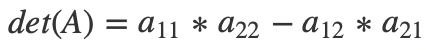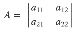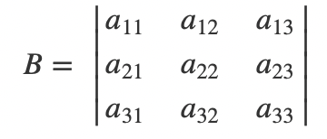 也就是说,行列式的输入是一个n * n的方阵,输出是一个具体的数。我们把行列式用det来表示,假设A是某一个n * n的矩阵,那么det(A)即表示该矩阵的行列式。