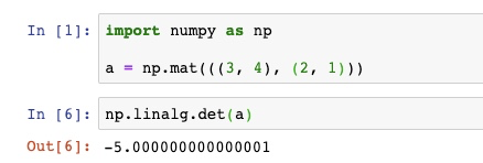 从上文行列式的定义很容易得出结论,行列式的计算比较复杂,如果我们自己实现,需要的代码至少在100行以上。不过好在Python的Numpy库当中为我们提供了非常丰富的矩阵相关操作,包括行列式的计算在内,因此,我们可以非常简单的实现行列式的计算。