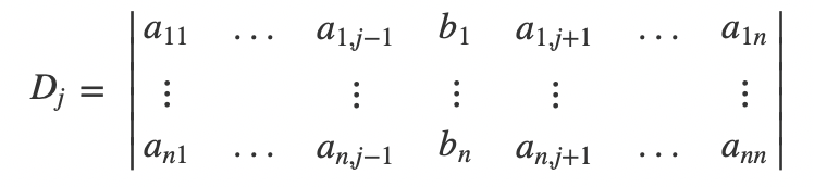 其中Dj(j=1,2,...n)是把D中第j列替换成方程常数项得到的新的行列式: