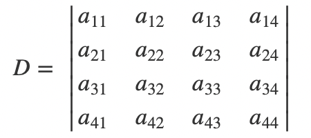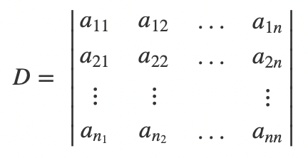 我们再回到n阶行列式来,理解了逆序数的概念之后,我们就很方便地可以写出n阶行列式的公式了。首先,先定义出矩阵D,是一个n阶的方阵: