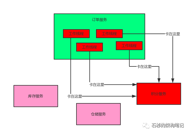 当然会导致订单服务里的那个用来调用积分服务的线程都卡死不能工作了啊!但是由于订单服务调用库存服务、仓储服务的这两个线程池都是正常工作的,所以这两个服务不会受到任何影响。