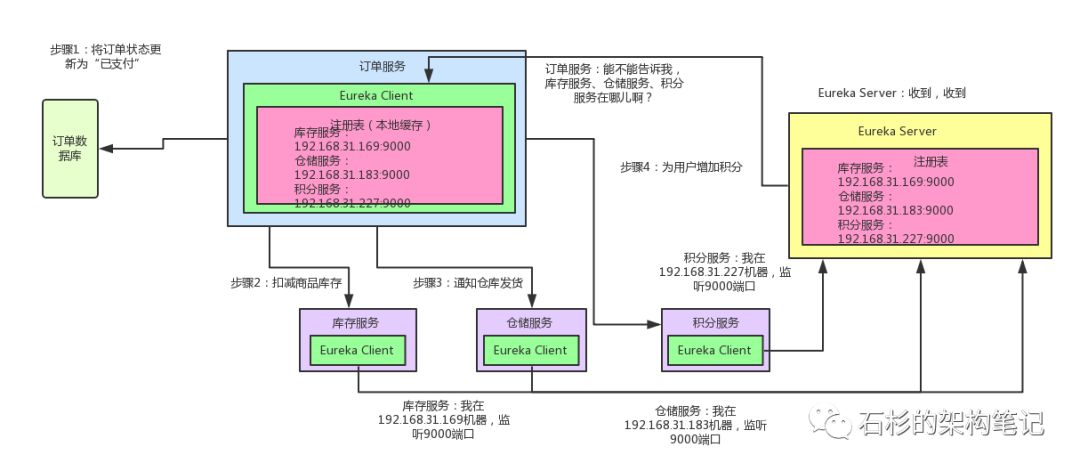 这时如果订单服务想要调用库存服务,不就可以找自己本地的Eureka Client问一下库存服务在哪台机器?监听哪个端口吗?收到响应后,紧接着就可以发送一个请求过去,调用库存服务扣减库存的那个接口!同理,如果订单服务要调用仓储服务、积分服务,也是如法炮制。