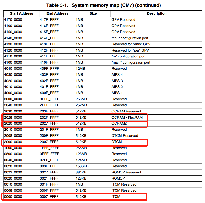 i.MX RT1060 有共有512KB的FlexRAM,可以配置为三种形态(ITCM/DTCM/OCRAM),默认ITCM/DTCM/OCRAM都是FlexRAM总容量,这并不代表ITCM/DTCM/OCRAM实际容量,只代表ITCM/DTCM/OCRAM可能的最大容量。另外还有512KB独立的OCRAM。ITCM的基地址0x0000 0000,DTCM的基地址0x2000 0000,OCRAM的基地址0x2020 0000。