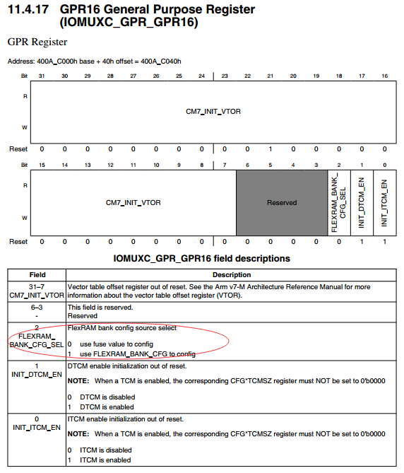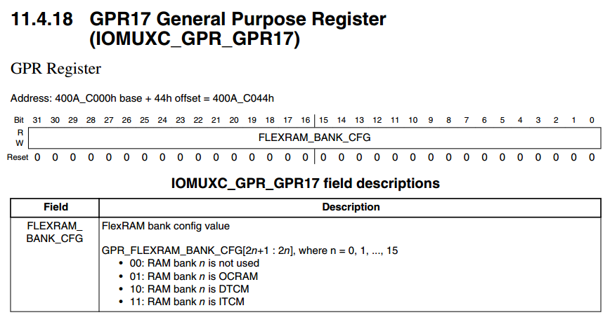 首先是指定FlexRAM各Bank的分配情况,利用IOMUXC_GPR17寄存器的FLEXRAM_BANK_CFG位,你可以自由指定每个Bank最终形态(ITCM/DTCM/OCRAM)。