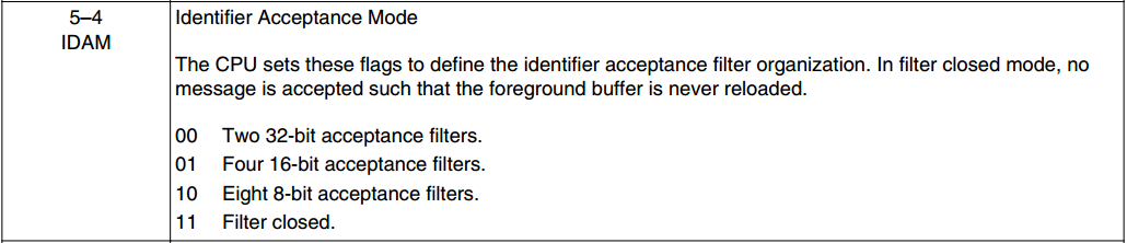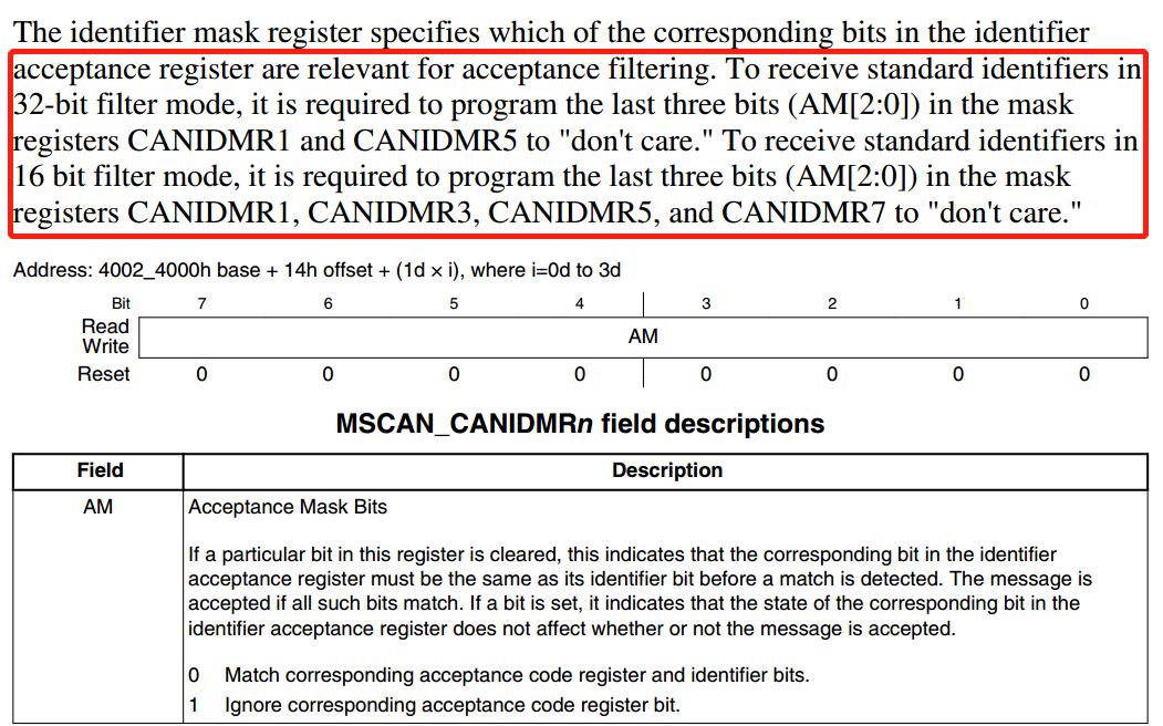 but 为了在32位过滤器模式下接收标准标识符,需要将屏蔽寄存器CANIDMR1和CANIDMR5中的最后三位(AM [2:0])编程为“无关位”;