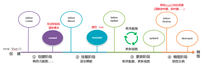 - 生命周期四个阶段:① 创建 ② 挂载 ③ 更新 ④ 销毁