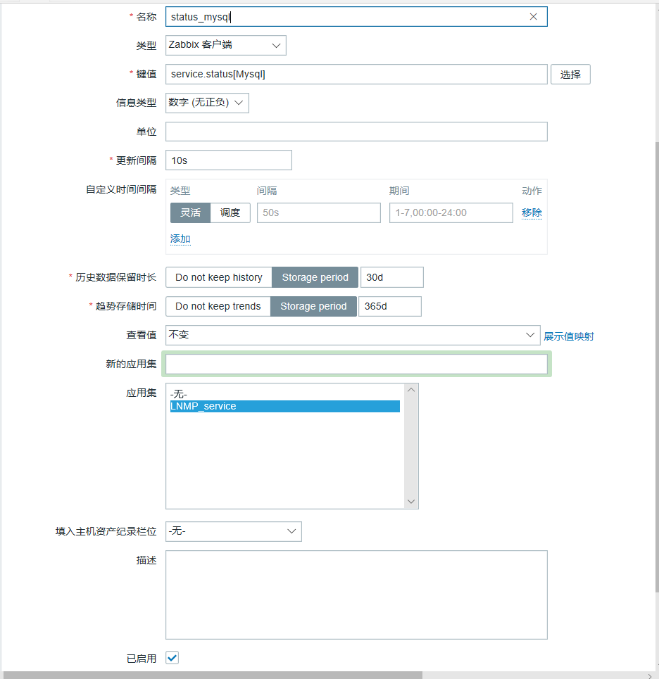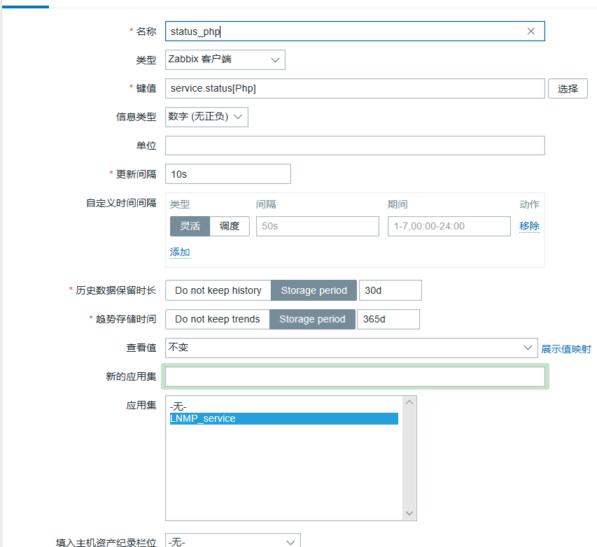 3)创建监控项(键值说明,这里我们得根据配置文件里面定义的来进行配置;service.status[Nginx])