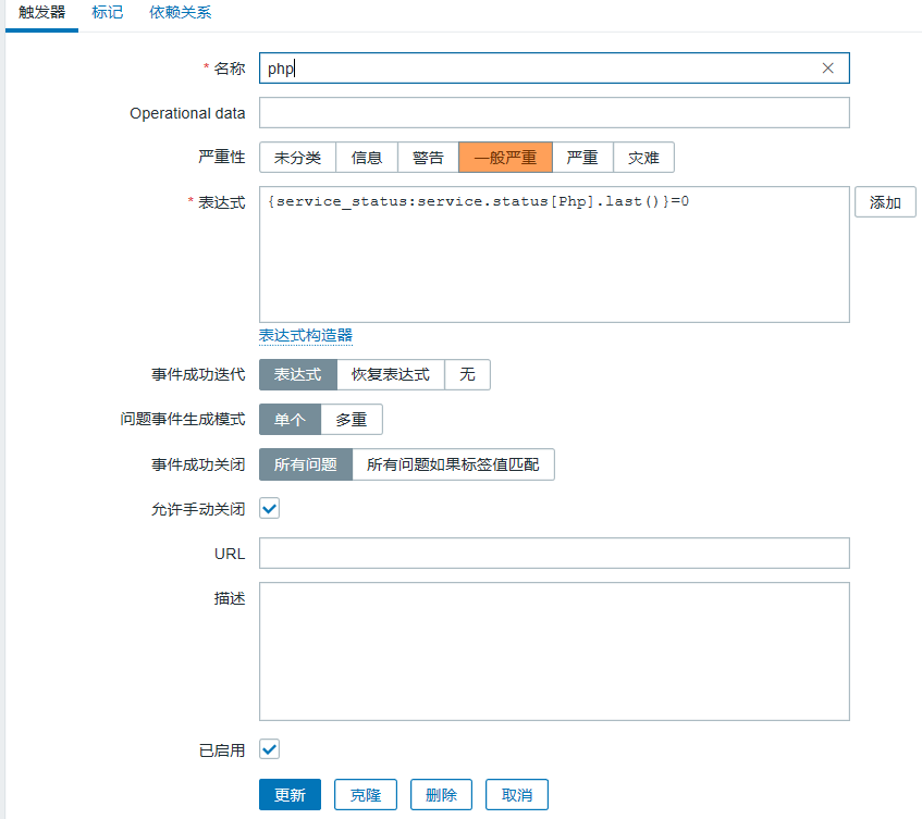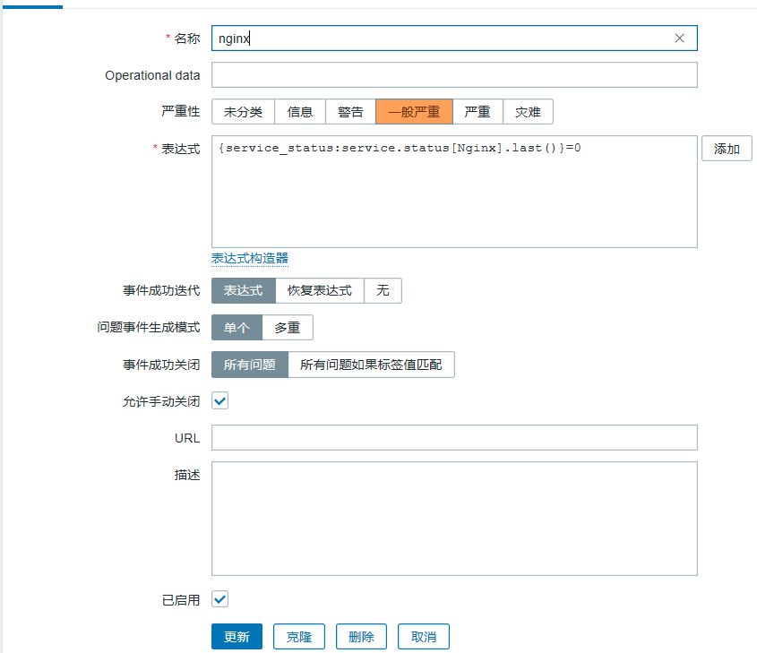 4)创建触发器(最新的t值说明:根据前面的命令结果判断,pidof nginx |wc -l ,如果nginx处于运行状态该值为1,反正为0则为挂了,所以这里触发器判断是否为0)