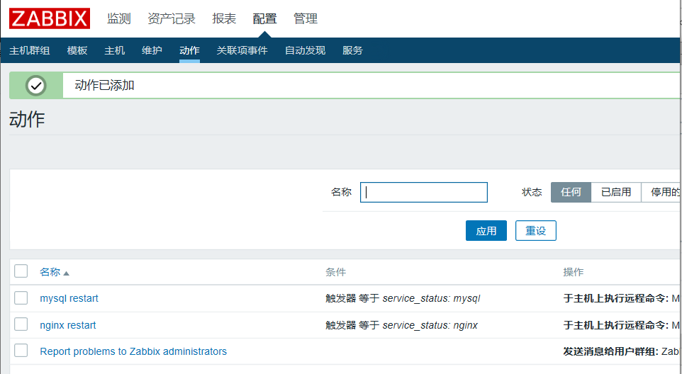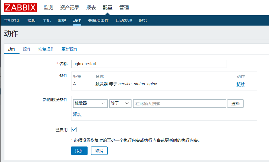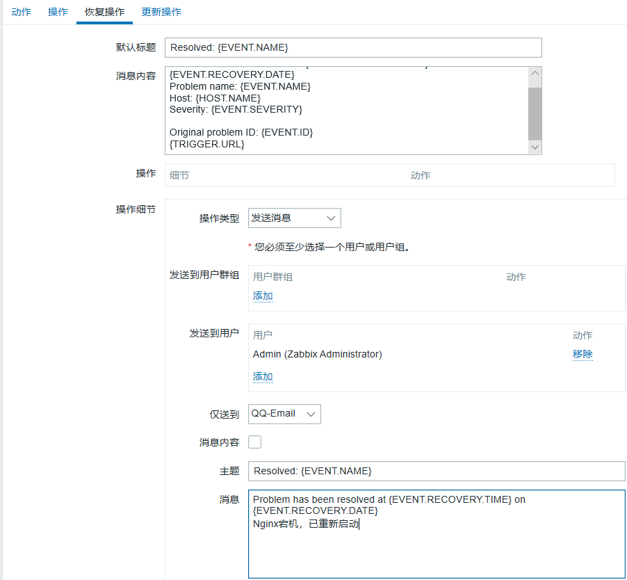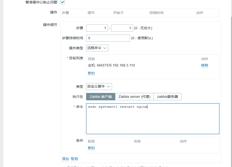 配置操作:配置操作时执行重启命令,(注意:因为zabbix 进程是使用zabbix用户来维护的,所以它没有权限去执行重启nginx命令,这里需要先在 zabbix-agent 上授权)