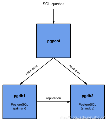 9.3之后支持的流复制机制可以方便的搭建主从结构的集群(包括同步复制与异步复制),因此Pgpool-II中比较常用的模式是流复制主从模式,其结构如下图(也可以一主多从)。