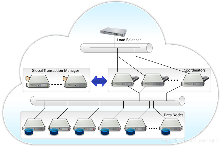Postgres-XL的机制和Pgpool-II大不相同,它不是独立于PG的,是在PG源代码的基础上增加新功能实现的。简单来说,Postgres-XL将PG的SQL解析层的工作和数据存取层的工作分离到不同的两种节点上,分别称为Coordinator节点和Datanode节点,而且每种节点可以配置多个,共同协调完成原本单个PG实例完成的工作。此外,为了保证分布模式下事务能够正确执行,增加了一个GTM节点。为了避免单点故障,可以为所有节点配置对应的slave节点。Postgres-XL结构图见下图,来自官网。
