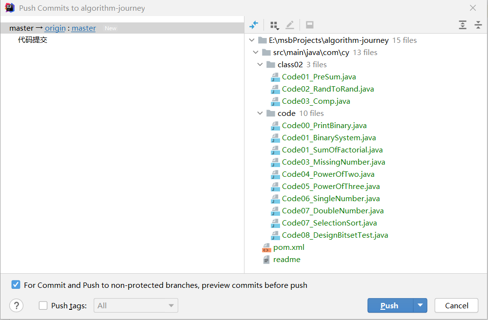 选择好当前开发的分支,进行提交。本地push到github上时,暂时没有别的分支就是master。