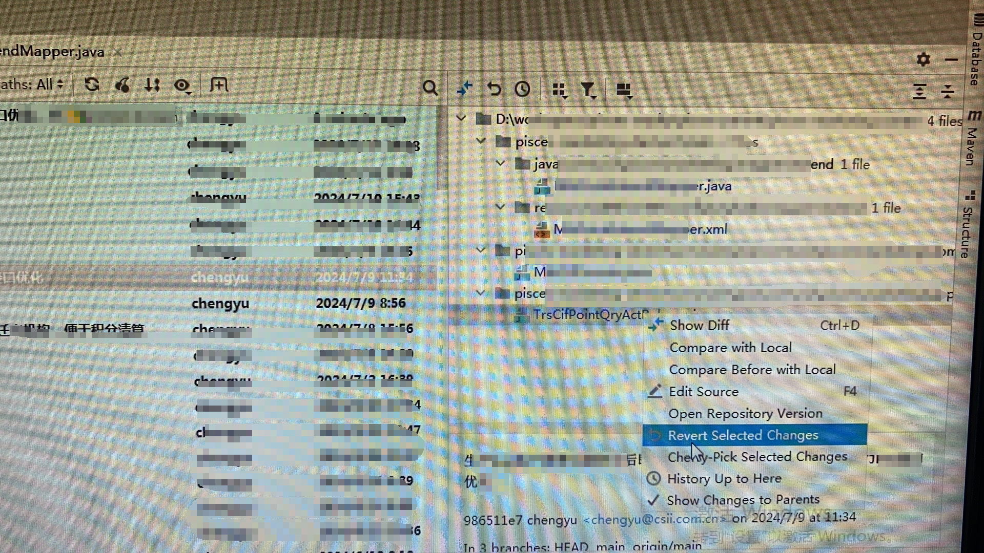 2.在右边显示的代码改动记录中,选择需要撤回的文件,右击选择Revert Selected Changes