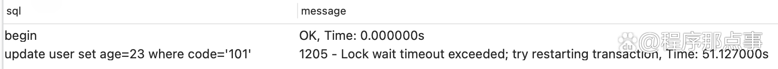 begin;select * from user where code='101' for update;update user set age=22 where code='101';