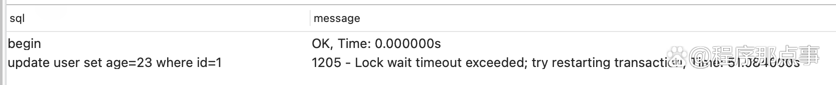 如果事务1一直都不释放行锁,事务2最后会报下面这个异常: