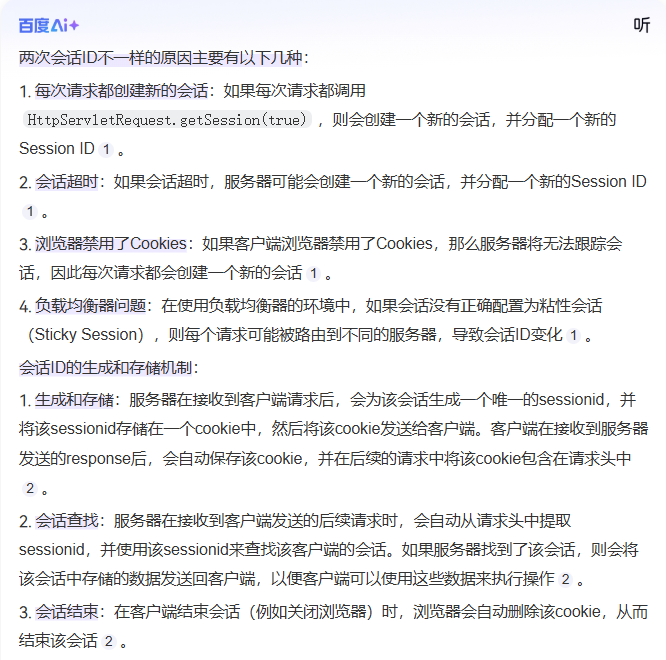 在Java Web开发中,Session ID是用来标识用户会话的唯一标识符。通常情况下,Session ID在用户第一次访问网站时生成,并在随后的请求中保持不变,直到会话过期或被显式地使无效。然而,在某些情况下,你可能会遇到Session ID不断变化的问题。这通常是由于以下原因: