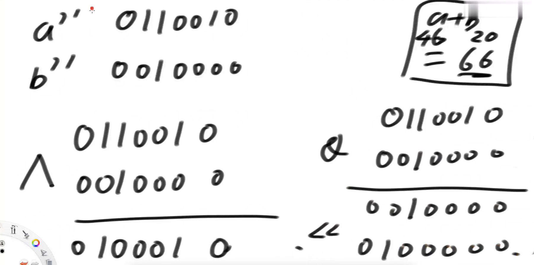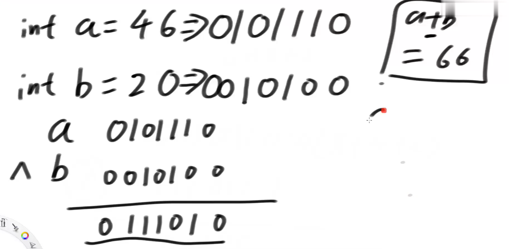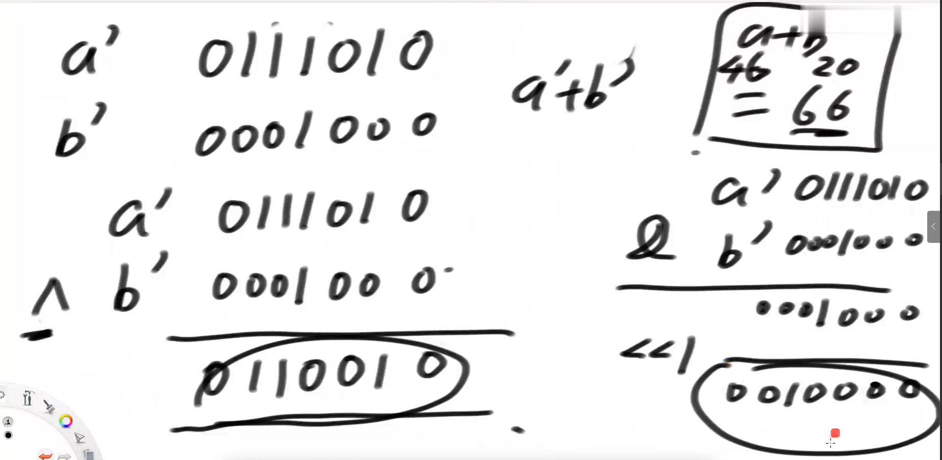 比如a+b无进位相加得到0111010 = 58,进位信息为1000 = 8,相加得66。