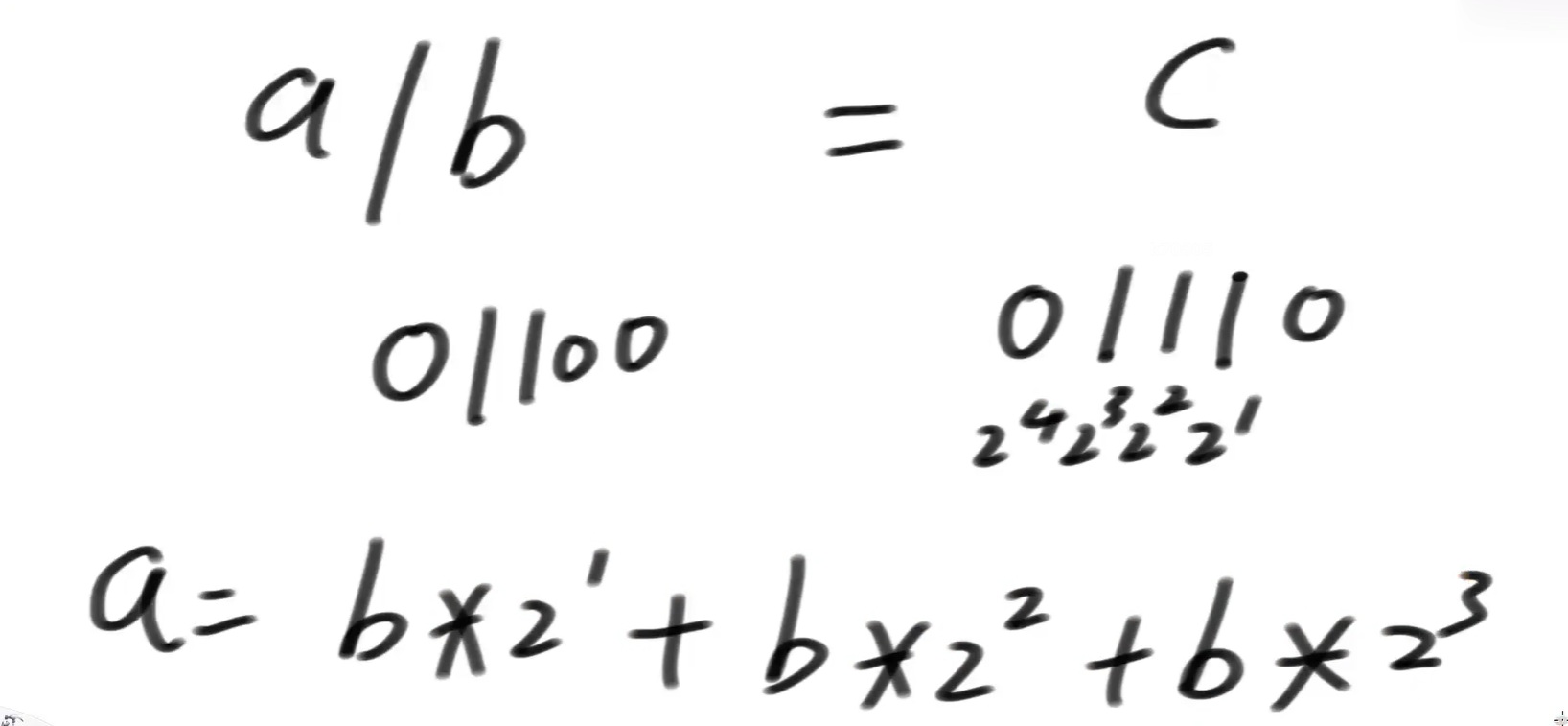 a': a - b*2⁷,再次找到最接近a'的2某次方 * b,假设是5,那么我知道最终结果5的位置上一定是1。