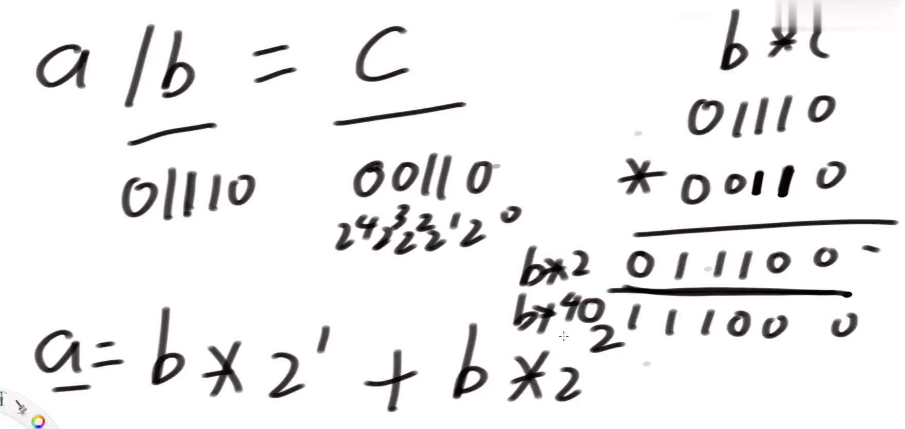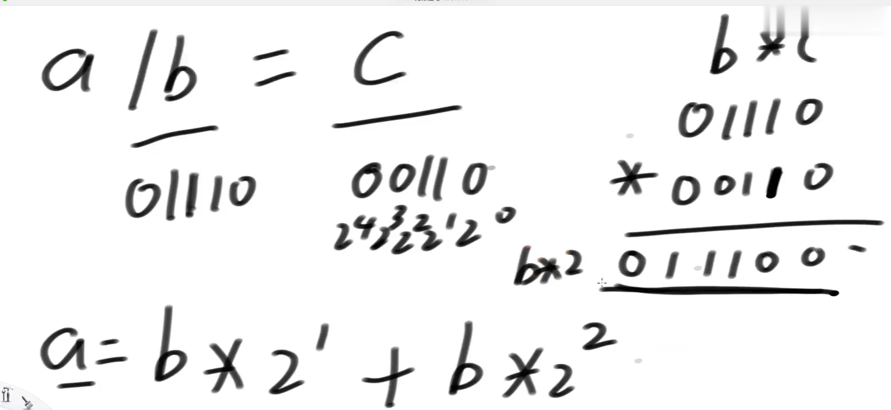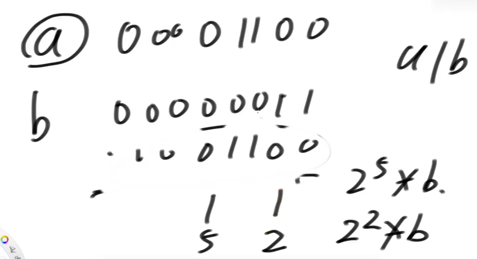 a'': a' - b*2⁵, 再次找到最接近a''的2某次方 * b,假设是3,那么我知道最终结果3的位置上一定是1。