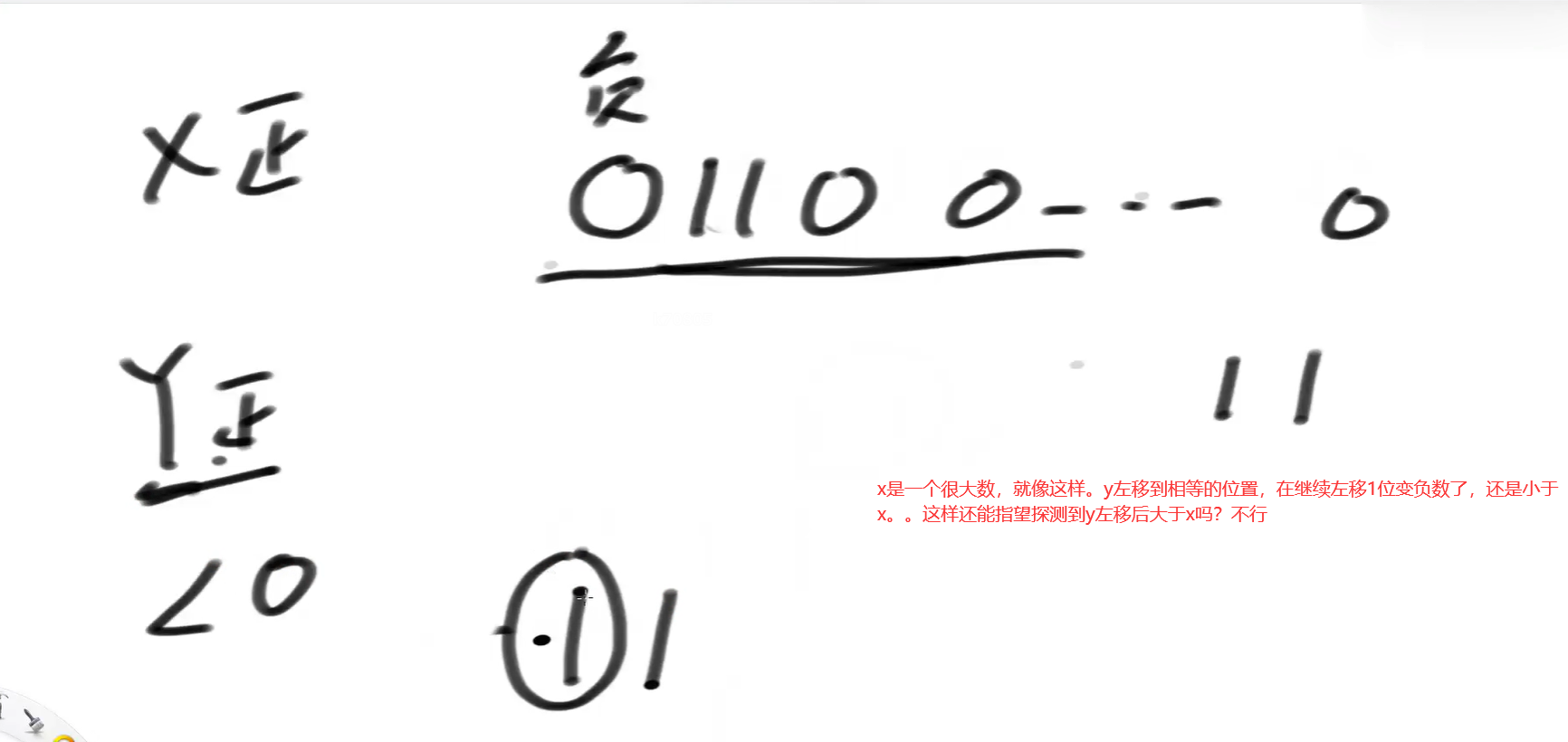 如下图,x是一个很大的数,y往左移去够x,左移n位正好等于x,但是还需要左移一位大于x了后才知道上一位是该来的位置,继续左移一位后到符号位了,y就变成负数了,还是不大于x啊。它还会左移,就会发生不可预知的错误。