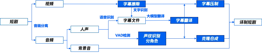 面对全球市场庞大的多元化受众,一部短剧可能需要译制几十个不同语言的版本,传统的短剧批量生成模式已难以匹配平台的本地化需求及高频次更新。而腾讯云MPS提供的智能短剧译制能力则可以帮助平台自动实现短剧内容多语言版本的快速处理及制作。无需代码开发,平台运营人员只需在MPS控制台配置好语种模版和编排,上传后的短剧就会自动通过画面字幕提取(OCR)、视频语音识别(ASR)、视频字幕擦除、大模型字幕翻译以及人声/背景音分离、AI配音等一系列处理,按预设要求压制为多个不同语种的译制短剧。