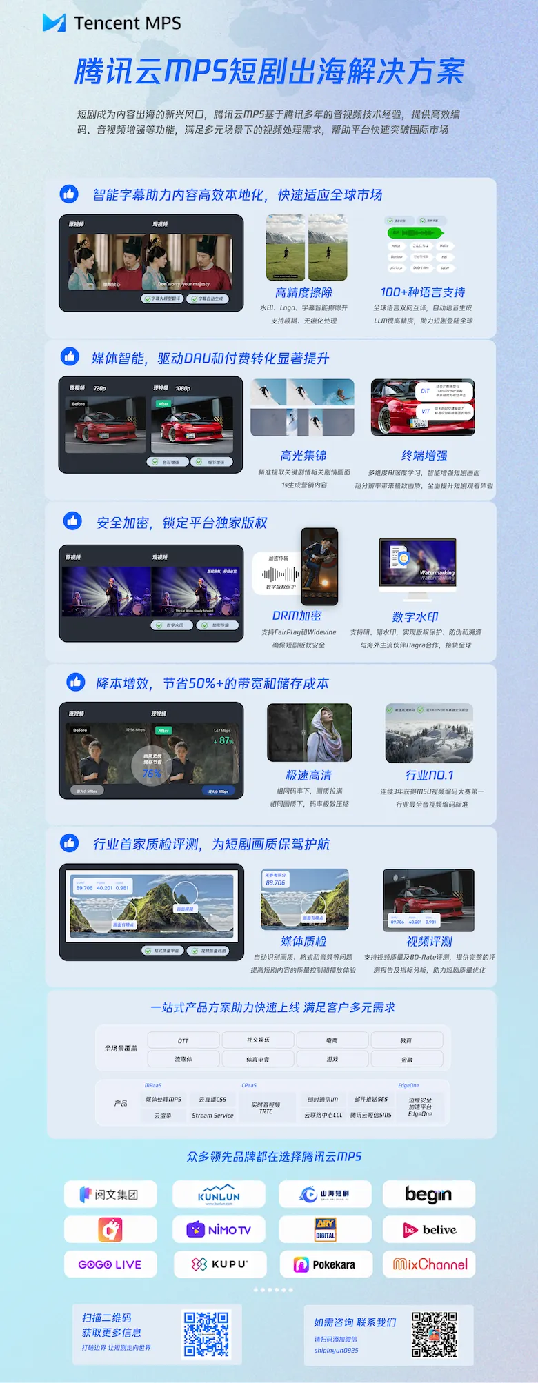 面对这些挑战,腾讯云媒体处理(MPS)基于腾讯多年的音视频技术经验,结合点播、直播、互动直播、云渲染等丰富产品矩阵,为短剧平台量身打造了一站式智能出海解决方案,提供全面的媒体AI和极致的编码能力,满足媒体处理及传输、内容本地化及安全、媒体智能体验、平台生态建设等多元场景需求。