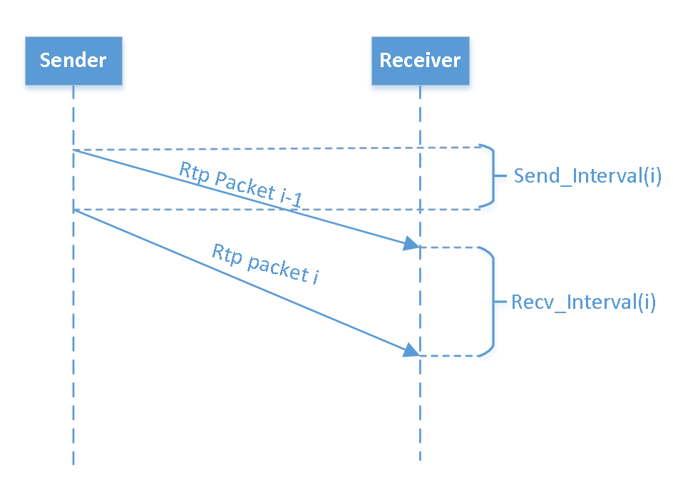 基于延时的算法一般通过测量 RTT(round-trip time 往返延时)或者 OWD(one-way delay 单向延时)来判断拥塞。RTT 测量比较直观,但是由于是测量双向延时的总体情况,因此反向的延时变化会对媒体流方向的网络拥塞判断造成干扰。OWD 延时观测通过观测发送间隔与接收间隔的变化来判断网络排队延时的状况则避免了这个问题。如下图所示: