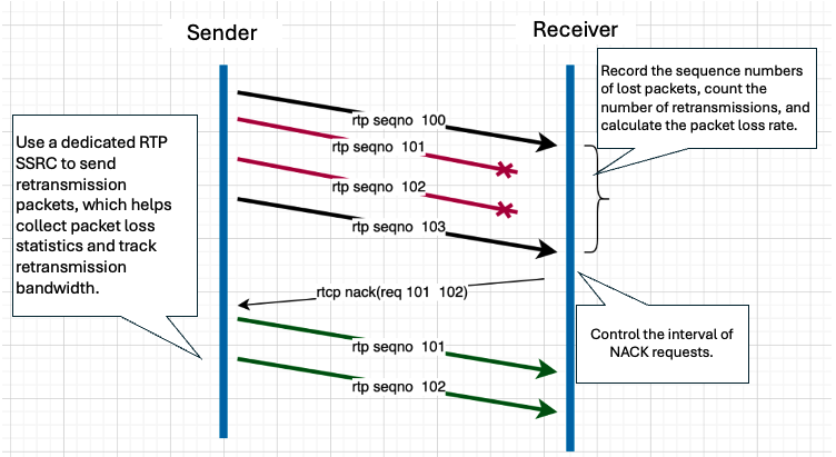丢包重传流程如下图所示:在 RTP/RTCP 协议中,丢包重传技术简单来讲就是接收端根据包序列号的连续性判断是否丢包,通过向源端发送 RTCP 中的 NACK 请求,要求源端重传指定的数据包。丢包重传流程如下图所示: