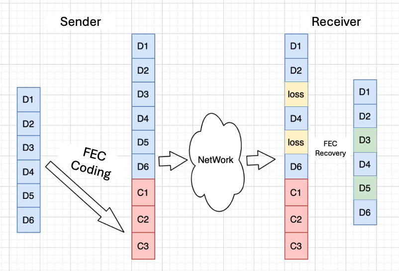 FEC 的基本思路粗略来讲就是发送端在发送音视频数据包之外,根据具体丢包状况再额外发送一定量的冗余数据包用于接收端进行丢包恢复,基本流程如下图所示: