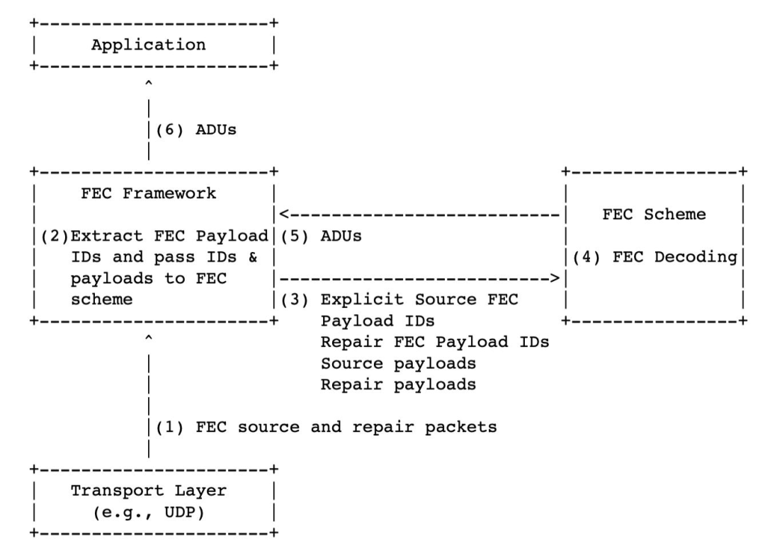 接收端收到 FEC 源包和修复包后送到 FEC 解码器。如果源包丢失,解码器根据包组的保护关系以及收到的包组状况进行解码修复,最后将修复完成的音视频包交由上层进一步处理,完成音视频解码与显示播放。