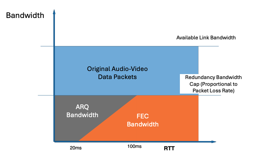 下图是在一定场景下的 FEC 与 ARQ 配合示意图,RTT 在 20ms 内,如果传输延时要求在 100ms 以内,在丢包 30% 的弱网链路上,则 ARQ 可以将丢包率降低到 1% 以下,则由 ARQ 负责丢包修复。随着 RTT 的上涨,FEC 的保护占比增加,最终由 FEC 单独负责丢包修复。
