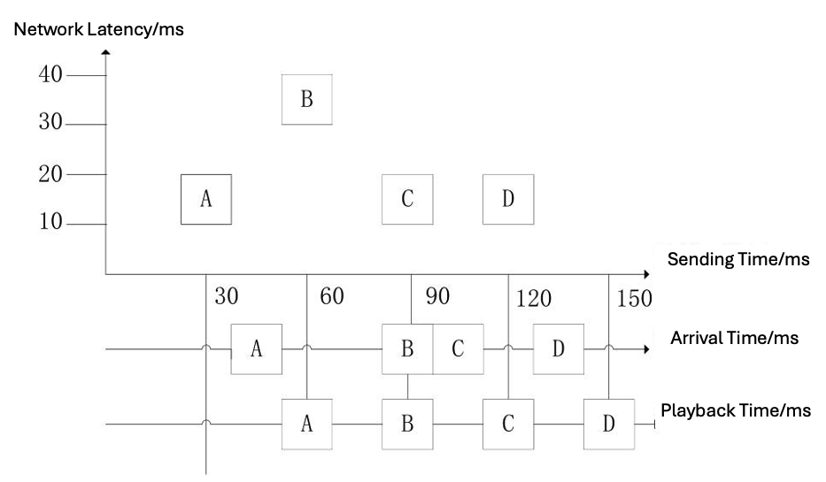 接收端通过增加抖动延时(JitterDelay)来吸收不均匀的延时,达到均匀播放的目的。其中,抖动延时大小的计算是抖动缓冲区性能好坏的关键,过大的抖动延时会引入额外延时,这在实时交互式应用领域是极力要避免的;过小又无法吸收全部的抖动。
