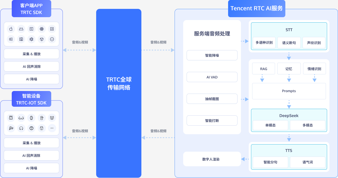 作为行业领先的RTC厂商,腾讯云TRTC为用户搭建了性能最优、延时最低的对接通道,在内嵌腾讯云ASR的同时,整合业内领先的LLM/TTS方案进行深度优化,将AI对话总延迟低至1000ms,媲美人类对话反应速度。在实现音视频数据高效采集、处理、传输的基础上,方案还融入了智能降噪、智能打断、上下文管理、声纹识别、语义断句、背景音、承接语等丰富能力,无需额外开发,集成即可获得自然、拟真的AI实时语音交互体验,帮助粉丝平台在最短的时间内实现AI交互模式升级。