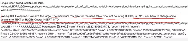 接着根据业务提供的具体SQL,appversion、datadata、elt_stamp、id这几个非大字段,也并没有超过限制,mediumblob类型字段最大可存储16M,业务的数据远远没有达到这个量级。按照报错的提示把 appversion、datadata、elt_stamp、id这几个非大字段均改成blob类型,还是无法解决(根据之前的分析,必然不是问题的根源)。