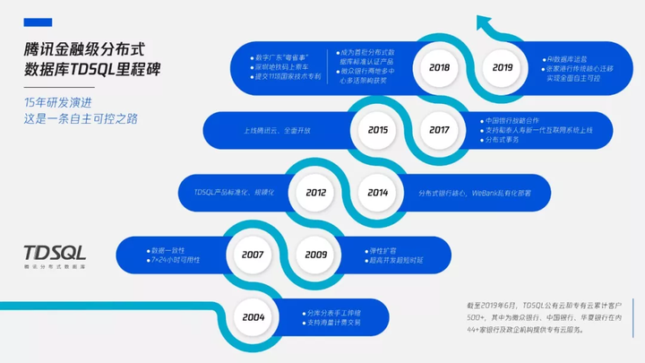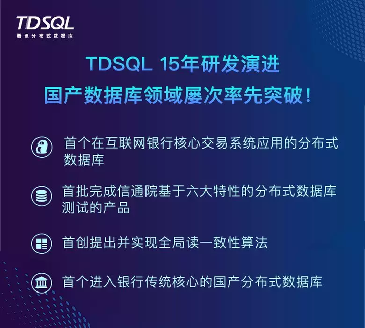 2019年,TDSQL在数据库自主可控领域实现多项创新突破。今年,TDSQL基础研究论文成果成功入选国际数据库顶级会议VLDB。在产业化领域,TDSQL成功助力张家港行成功率先将银行传统核心系统由集中式数据库存储改造为分布式数据库存储,打破了该领域对国外数据库的长期依赖。这也是在国内银行首次在传统核心业务系统场景下,采用国产分布式数据库。而采用TDSQL搭建的新一代核心系统性能也表现优异:高频账户类交易耗时在300毫秒之内,20秒内可以完成1万笔批量代发代扣业务……而架构成本降至1/5甚至更低,稳妥实现降本增效。