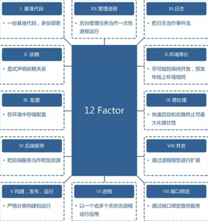 它定义了一个优雅的互联网应用在设计过程中,需要遵循的一些基本原则,可看做云原生应用开发的“十二条军规”。