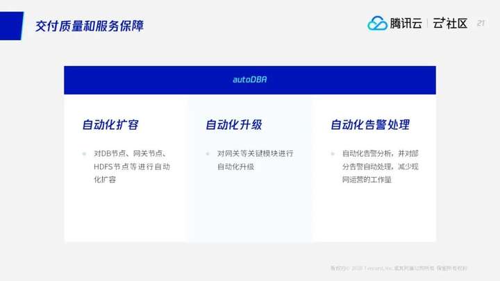 最后是跟我们客户最后,在客户日常运营、日常变更相关的中,可能大部分运营面临的大部分问题是怎么去扩容、升级、处理告警?怎么扩容?我们TDSQL会对各个节点的扩容有一个提供了自动化的扩容方案,可以一键的扩容。同样升级也是提供了前台化一键操作的功,功能,既可以进行点对点的升级,也可以进行整个集群的批量升级,这个也是我们有一个前台化的升级工具。TDSQL的高可用性一方面在于自身的弹性架构和容灾能力,以及数据强一致性。