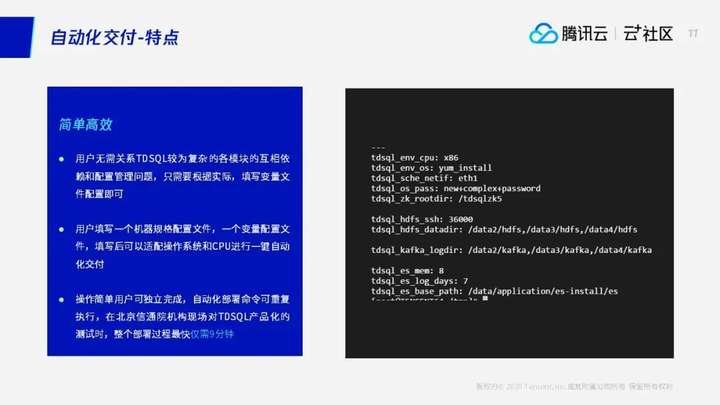 客户就可以通过填写我们的配置文件。其实已经做了一些适配,包括对我们的内核包,首先对我们的TDSQL的内核包是出了不同CPU架构的内核包。还有对我们交付逻辑上做了对各个操作系统和CPU的兼容。其实客户无须关心TDSQL比较复杂的模块之间的依赖和配置关系,只要根据实际情况填写变量的配置文件就可以了,填写完了以后就可以执行我们交付的发起命令,可以一键自动化交付。