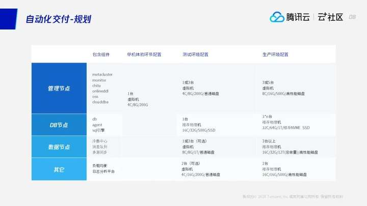 最终是大家最关心的生产环境的要求,我们这里要求的是:生产环境中要求管理节点,可以部署在三台或者五台是虚拟机,但三台或者五台,最好是跨三个机房,比如说“1+1+1”的模式或者“2+2+1”的模式,因为我们的原元数据集群是一个基于多数选举的机制来保障高可用,如果是只有两个机房的话,则会失去了他本身容灾的意义,因此我们建议生产环境这里是中部署三个机房。DB节点生产环境更推荐的是NVME接口的SSD,因为传统的SSD和NVME的SSD可能体现他的在接口性能上,会有比较大的性能差距。这里而数量上我们推荐的数量是3*N台,其实——事实上这个是我们要去评估的生产环境TDSQL集群的数据量。因为我们,TDSQL是一个分布式的数据库,他的数据量级可以根据用户是根据你的机器数量实现做一个水平拓展扩容。