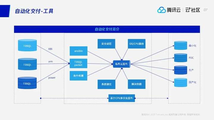 刚才说我们TDSQL是基于一个分支去做的来实现多场景、复杂关系下的自动化交付的,其实也可以说是基于三个分支去做的。我们TDSQL内核包,当前有三个分支,是:基于CPU的多分支进行发布,当前支持X86、arm、power。其实在我们TDSQL对客户的发布包中,一个包自动的集成了不同CPU版本的TDSQLpocketpacket,是——以ansible组件为基础,加上了条件检测、操作系统调优、环境依赖的解决、安全规范、兼容性问题,我们对外做的是TDSQL私有云标准的发布包。像这个包我们是,可针对于客户不同的场景,刚才说到的不同场景和不同的环境做的适配。
