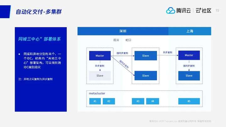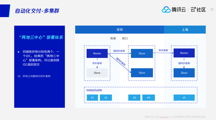 “同城三中心”架构顾名思义:在一个城市有A、B、C三个机房,TDSQL仍采用“一主两备”结构,很显然我们需要将三个数据节点分别部署在三个机房,其中主节点在一个机房,两个备节点分别部署在另外两个机房。同城双中心的架构下我们是有两套集群,第一套集群是蛇口这个集群,我们是交付一套集群。然后在观澜集群是交付另一个集群。我们在两个集群之间做了一个异步复制,这个是同城双中心。第二个是“同城三中心”,我们是架构的部署下,是在一个大集群内,在这个数据库实例下,我们数据库实例使用使用的是同IDC异步、跨IDC强同步的方式,然后在这边上海会有一个强同步的实例,实例之间会做一个DCN的复制实现金融级高可用容灾。“两地三中心”架构顾名思义:在一个城市有A、B两个机房,另一个城市有C机房,在第一个城市中TDSQL数据库实例采用同IDC异步、跨IDC强同步的方式,我们需要在第一个城市将四个数据节点部署在二个机房,其中主节点和一个备节点在一个机房,另外两个备节点在另一个机房。并且在第一个城市和第二个城市的数据库实例间,采用的是异步复制,保障金融城市级高可用容灾。