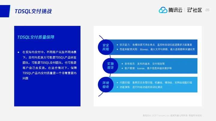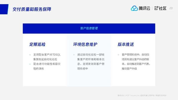 其实我们TDSQL交付质量服务和保障就是围绕着上述的一些各方面问题方面,实现由在不同的实施人、实施方去交付我们TDSQL的产品下,都能保证我们TDSQL的投产的质量。这是我们在做的一个事情。