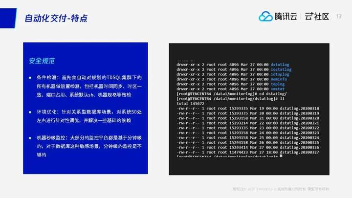 我们在交付的场景下也做了一些优化,首先我们会对整个TDSQL规划的集群下的所有机器做前置检测,包括常见的机器的时间同步、机器的时区、端口占用、系统默认sh、机器规格。我们会对环境进行优化,刚才有提到一些操作系统的内核参数,针对于关系型数据库场景,比如说TCB的一些优化,像一些内存参数的优化,其实我们做了一些调优,并解决了一些技术的依赖。还做了一个秒级的监控。其实客户自己的监控平台,包括我们本身给客户提供的监控中心,大部分的监控体系是基于一个分钟级的,但是数据库这样的场景比较特殊,其实很多的问题在分钟级的监控下,问题的现场就会丢掉,不能暴露问题的本身。所以我们针对这样的场景做了提供了秒级的监控,我们做了几个维度,有包括针对机器的IO、CPU、网络、内存等等多个维度。
