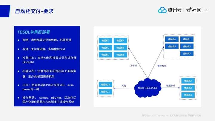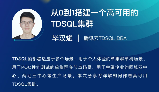 为帮助开发者更好地了解和学习分布式数据库技术,2020年3月,腾讯云数据库、云加社区联合腾讯TEG数据库工作组特推出为期3个月的国产数据库专题线上技术沙龙《你想了解的国产数据库秘密,都在这!》邀请数十位鹅厂资深数据库专家每周二和周四晚上在线深入解读TDSQL、CDB/CynosDB、TBase三款鹅厂自研数据库的核心架构、技术实现原理和最佳实践等。本文将带来直播回顾第七篇,分享TDSQL的部署实践。