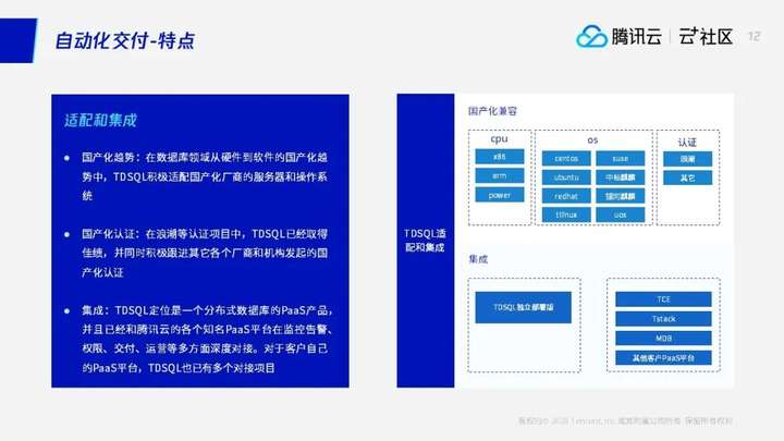 刚才有说到我们TDSQL在国产化方面也做了很多工作,当前国产化已经成为一个趋势,TDSQL在国产化适配方面也做了很多工作,从我们底层的服务器到存储器、操作系统、CPU、行业软件、数据库软件等,都是在相关部门指导下国家的领导下进行了联系与各个厂商合作实现从下层到上层全方位的做国产化适配。在国产化的浪潮下,我们TDSQL作为一个腾讯自研分布式数据库,他作为一个优秀的国产化数据库,其实我们也是义不容辞的担当了我们国产化的责任。我们当前其实是从CPU、操作系统都去做兼容,操作系统刚才有几个没有说到。centos、ubuntu、suse,像这几个可能是大家常见的主流操作系统,包括腾讯内部的操作系统tlinux是腾讯内部的一个操作系统,以及中标麒麟、银河麒麟、UOS是等常见的主流国产化操作系统,我们都有TDSQL都完成了适配。除了我们列出来的这些CPU的适配、操作系统的适配,适配全系国产操作系统,TDSQL同时已相继完成对全系国产芯片,全系列国产服务器等的兼容适配工作。而在完成适配工作的同时,腾讯也提供了对应的技术服务,帮助行业用户更好地迁移到国产基础技术生态当中。刚才提到有很多服务器CPU的一些硬件厂商做国产化,我们和浪潮也做了一些测试和认证,并且拿到了浪潮的认证,除了浪潮的以外,我们还在很多其他的国产化的客户项目中,可能更多偏向于政府和国企相关,也同时并行做这些国产化的项目,并且已经拿到了一定的成果。这个些是我们对国产化的方面的工作。